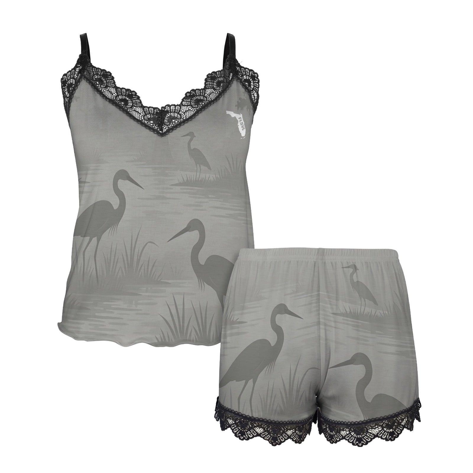 The camisole top features a classic V-neck design accented by delicate lace detailing at the neckline and hem, lending a graceful, sophisticated charm. The set showcases the atmospheric, all-over tonal printing of the Everglade Veil pattern, echoing the misty beauty of herons and cypress shadows. Black buttons on the top ensure easy wear and a timeless finish.